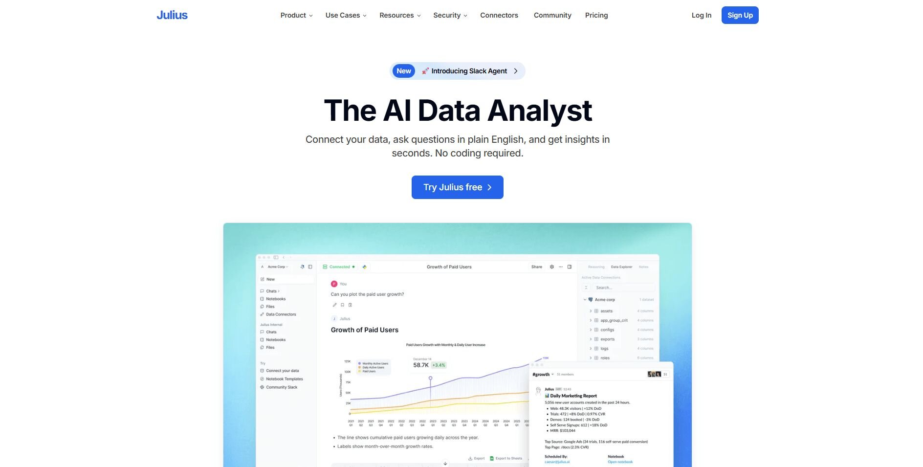Julius is an AI-powered data analysis tool that connects to your data and returns visuals and explanations through simple prompts.