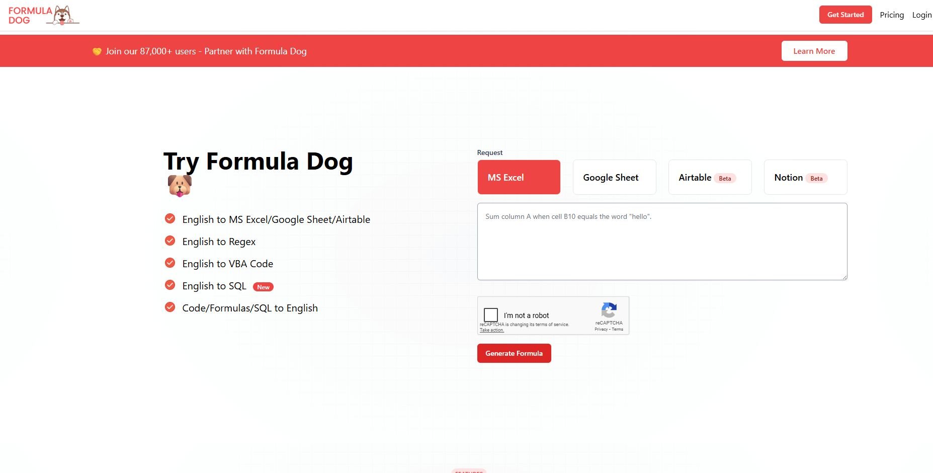 What it does: Formula Dog turns plain text into Excel formulas, SQL queries, and VBA snippets. It also explains existing functions so you can adjust them with more confidence. You can access it through the browser or the Excel add-on.