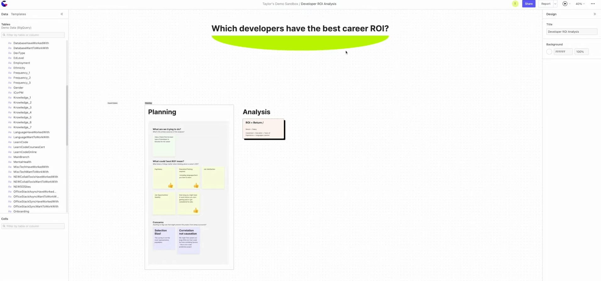 Version history helped us roll back changes when needed, and the commenting system kept discussions attached to specific cells instead of scattered across Slack. The notebook stayed responsive even when multiple people ran queries at the same time.Why it beats Hex