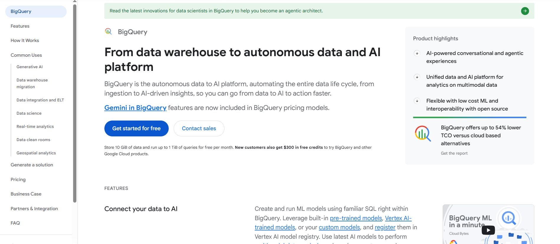 BigQuery is a serverless warehouse from Google Cloud. I liked how the pay-per-query model made it simple to run analysis without worrying about credits. In testing, it scaled smoothly from small lookups to terabyte scans. I also tried BigQuery ML, which let me train models directly in SQL, a nice shortcut when I didn’t want to spin up separate infrastructure.