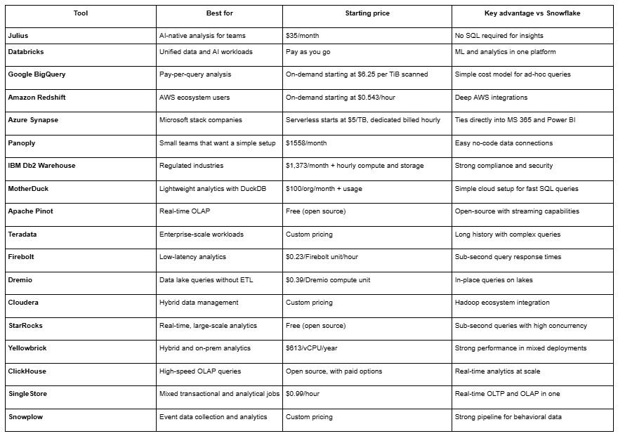 Snowflake competitors are a better fit if credit-based pricing runs high or your team wants simpler tools. Platforms like Databricks and BigQuery focus on scaling AI and ad-hoc analysis, while Julius makes queries easier for non-technical users.