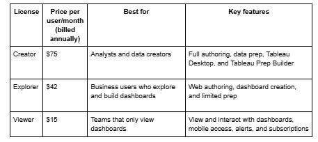Tableau offers three main subscription tiers that scale by features and user roles. Here are the prices and what each includes: